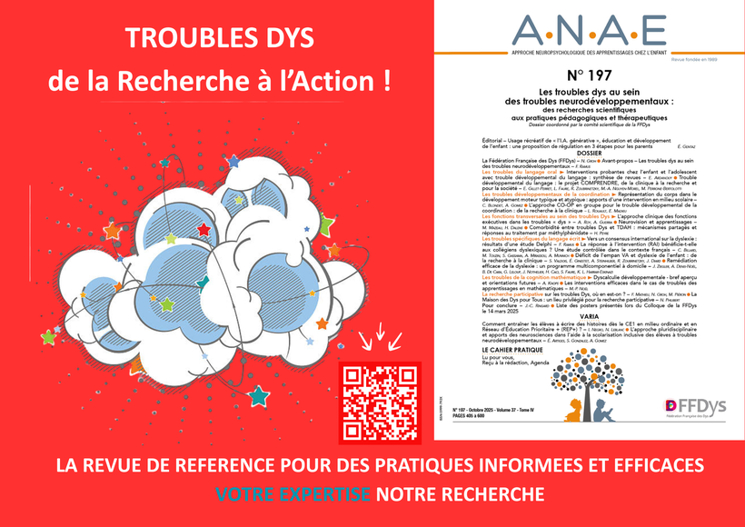 Troubles Dys et TND : unir les connaissances, reconnaître les spécificités, agir ensemble La FFDYS et la revue ANAE consacrent un colloque scientifique et un numéro spécial aux troubles dys, replacés dans le champ des troubles neurodéveloppementaux (TND) : 👉 Objectif : mieux comprendre, mieux repérer et mieux accompagner les enfants et adolescents concernés. 🔹 Des spécificités à reconnaître Contrairement à d’autres TND, les troubles dys apparaissent souvent plus tardivement, car ils se révèlent principalement à l’école. Cela nécessite des dispositifs de repérage, de diagnostic et de prise en charge adaptés – et non de simples extensions de ceux pensés pour d’autres TND. 🔹 Une approche scientifique globale Le numéro met en lumière : • Les recherches sur tous les troubles dys (langage oral, coordination motrice, langage écrit, cognition mathématique). • Les troubles cognitifs transversaux (attention, fonctions exécutives, neurovisuelles) qui aggravent les difficultés des enfants dys. • Les particularités neuropsychologiques des troubles dys, nécessitant une expertise spécifique. 🔹 Des recherches utiles et ancrées dans la pratique L’accent est mis sur les interventions pédagogiques et thérapeutiques, les recherches participatives et celles qui évaluent rigoureusement leur efficacité, dans le respect du consensus scientifique international. 🔹 Un enjeu collectif Ce travail souligne à la fois : • L’appartenance des troubles dys à la grande famille des TND. • Leurs spécificités propres, qu’il est essentiel de prendre en compte pour bâtir des politiques inclusives. • La richesse et parfois la méconnaissance des recherches francophones dans ce domaine. 👉 Ce colloque et ce numéro d'ANAE sont une opportunité unique : • Pour les professionnels de santé et de l’éducation, d’actualiser leurs pratiques. • Pour les parents, de trouver des réponses validées scientifiquement. • Pour tous, d’avancer ensemble vers une meilleure reconnaissance et une prise en charge adaptée des troubles dys. |